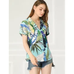 Allegra K Women’s Hawaiian Floral Leaves Printed Short Sleeve Button Down Vintage Beach Shirt