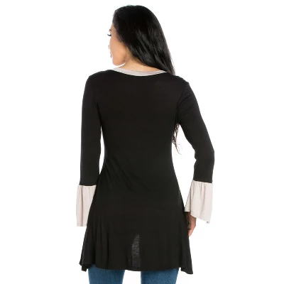 This tunic top is all about the modern color block design with beige on black. Dainty bell sleeves, a scoop neckline, and a hi-low shape. The stretch material ensures you will look your best and feel comfortable at the same time.