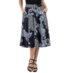 Introducing our Black Paisley A Line Midi Skirt with Pockets, a perfect fusion of style and practicality. Meticulously crafted with meticulous attention to detail, this exquisite skirt showcases a knee length A line silhouette that effortlessly flatters your figure. The captivating paisley pattern in timeless black exudes sophistication, while the addition of functional pockets adds a touch of convenience to your ensemble. With its comfortable elastic waistband, this skirt ensures a seamless fit throughout the day, allowing you to move with confidence and ease. The high quality fabric drapes gracefully, accentuating your natural silhouette with elegance. Whether you are dressing up for a formal occasion or going for a relaxed yet chic look, this versatile skirt is a must have in your wardrobe. Elevate your style with our Black Paisley A Line Midi Skirt with Pockets and make a statement that captures both fashion and functionality.