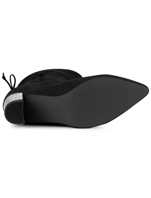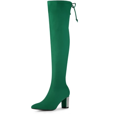 - Over the Knee High Boots, Chunky Heels, Pointed Toe, Rhinestone Decor, Lace Up Closure