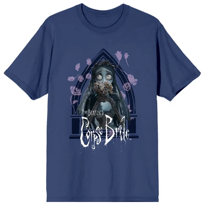 Celebrate your favorite movies with this Corpse Bride tee. The shirt features an image of Emily holding a bouquet of flowers at an altar while pink roses surround the character. White letters below the image spell out the movie’s title. The tee comes in a navy short sleeve crew neck. Fans of the Corpse Bride movie will love this comfy cotton t-shirt.