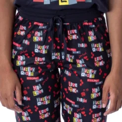 - HIGH-QUALITY PRINTED GRAPHICS – The shirt top features Harley Quinn in a cartoon style with her signature bat and the saying ‘Mad Love’. The jogger pajama pants feature an awesome all-over print of several Harley Quinn iconic phrases and symbols.