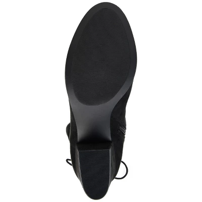 Change it up with the Wide Calf Leeda boot by Journee Collection. This adorable heeled boot features a lace-up detail in the back with a bow to finish it off. There is also a stretch gore on the side as needed to extend. You’ll look fabulous in this beautiful faux suede heeled boot. At Journee Collection, our boot styles will have your outfit looking even better than before. They will give you that finishing touch that will have your outfit looking straight out of a magazine.