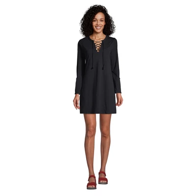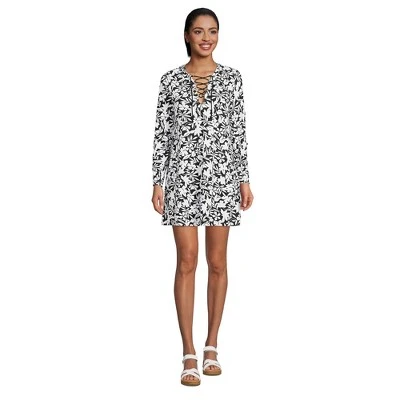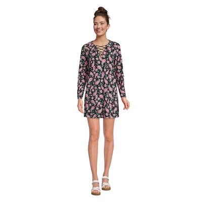 At Lands’ End we believe every body is a beach body. But there are still times when you need something to wear over your favorite swimsuit and this gorgeous cotton dress is the perfect choice. Incredibly comfortable it provides modest coverage and has an eye-catching drawstring detail at the neckline. The three-quarter length sleeves have functional tabs that let you quickly adjust their length and it hits above the knee so it’s easy to move around in but still looks like a stylish dress. Pair it with strappy sandals bohemian sunglasses and a woven tote and you have chic look that’s perfect for lounging poolside or grabbing lunch in a cute cafe. Of course it’s also great for wearing over your bikini halter tankini or one-piece bathing suit on the drive home from the lake. And since it’s made from pure cotton this packable lightweight and breathable ladies swim coverup dress can be tossed in the machine with the rest of your laundry. No special care is required.