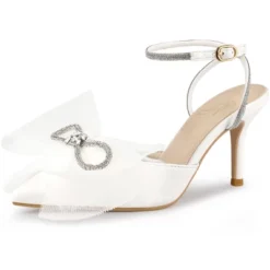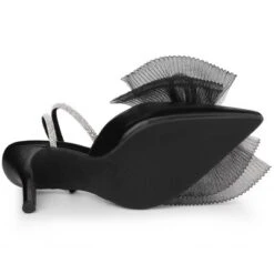 A must-have in every girl’s closet! Gorgeous high-heel pumps with a rhinestone and mesh bow. The slingback design for these pumps is a fashionable style. Design Details: Rhinestone; Mesh Bow; Ankle Strap; Pointed Toe; Slingback; Stiletto Heels; Comfortable Insole; Material: 2 colors: Black, White Faux Leather Upper; Rubber sole; ABS Heel; Heel Height: 3.3″ (approx 8.5cm).
