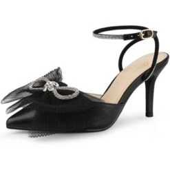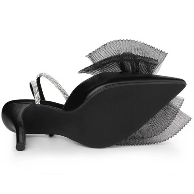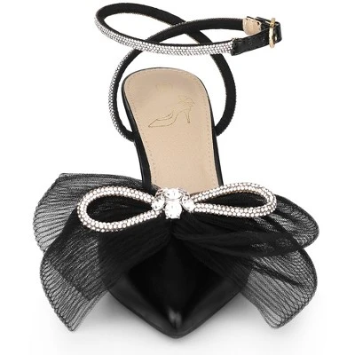 - FEATURES: rhinestone; mesh bow; ankle strap; pointed toe; slingback; stiletto heels sandals