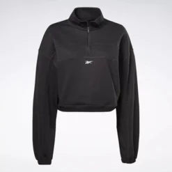 Layer this women’s Reebok sweatshirt over a tee and you’re all set for a trip to the gym a walk with the dog or whatever the day has in store. The quarter-zip style is made in cozy French terry with a casual loose fit. A stand-up collar fends off chill winds.