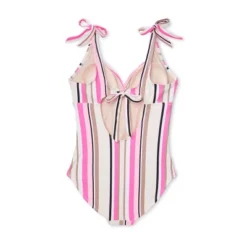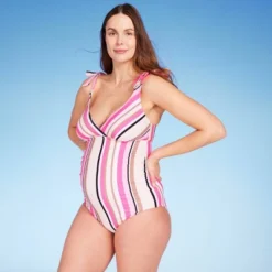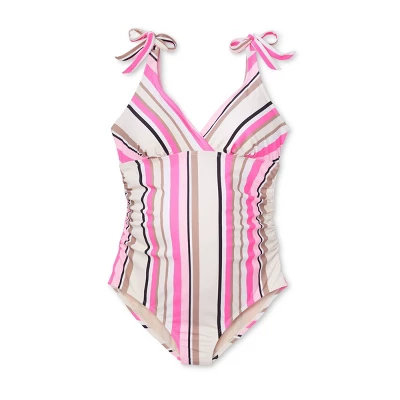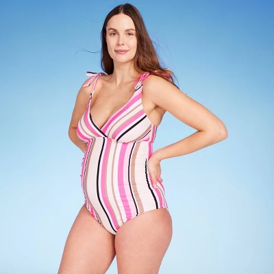 Add timeless style to your maternity swim looks with the Tie Strap One-Piece Maternity Swimsuit from Isabel Maternity by Ingrid & Isabel™. This one-piece maternity swimsuit features a striped pattern in pink, black and white hues for a bright look. The deep neckline with tie accent along the shoulders elevates the look, while the cinches along the sides help accommodate your growing bump. Designed with soft and stretchy fabric, this tie strap maternity swimsuit offers comfort and the right coverage with the sewn-in cups.