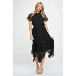 We love this attractive Cutout Handkerchief Hem dress in a beautiful Georgette fabric that has all of the features to be one of our favorites. Flutter Sleeve, Cutout details, Elasttic waist with a tie and Halter neck w/ button closure. It is also fully lined for coverage. This feminie yet sophisticated touch makes it a perfect choice for parties, events and date night. Material – Self/Lining: 100% Polyester. Made in China. Machine washable.