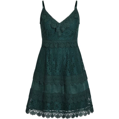 Look elegant in emerald green with the dreamy Nouveau Lace Dress. This dress includes a deep V-neckline with adjustable shoulder straps and a layered lace finish for a show-stopping look.Combine this dress with a pair of slip-on black pumps!Bold, stylish, glam and chic, no one does plus size fashion like City Chic. Loved around the globe for its diverse range of fashion-forward designs, City Chic flaunts figure-loving styles for any occasion. From show-stopping evening gowns to workwear and casualwear, City Chic will take your style to bold new heights. Available in sizes 12 – 24.
